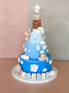 Εντυπωσιακή 3όροφη τούρτα με 3d χειροποίητη διακόσμηση : χαριτωμένα αρκουδάκια , σύννεφα και ενα μικρό αερόστατο στην κορυφή . Ιδανικό σχέδιο για πρώτα γενέθλια ή βάπτιση . Μπορεί να συνοδευτεί με θεματικά κεράσματα
