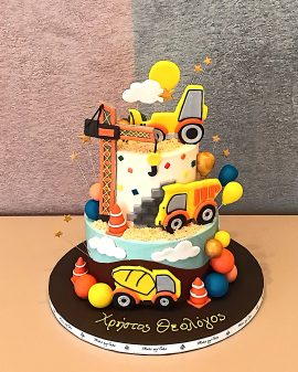 Τούρτα 2όροφη με θέμα εργοτάξιο . Η διακόσμηση (γερανός , μπουλντόζα, εκσκαφέας, φορτηγό) είναι απλικέ , χειροποίητα απο ζαχαρόπαστα . Η τούρτα είναι naked (με καλυψη βουτυρόκρεμας) , μπορεί ομως να γίνει και με κάλυψη ζαχαρόπαστας