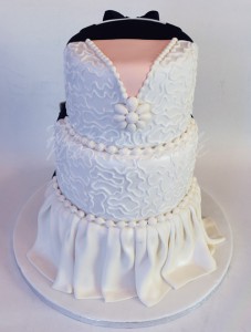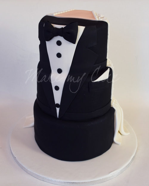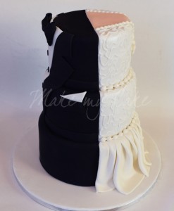 Τούρτα γάμου τριώροφη (από 45 άτομα και πάνω) με γαμπριάτικο κοστούμι στην μία πλευρά και νυφικό από την άλλη.