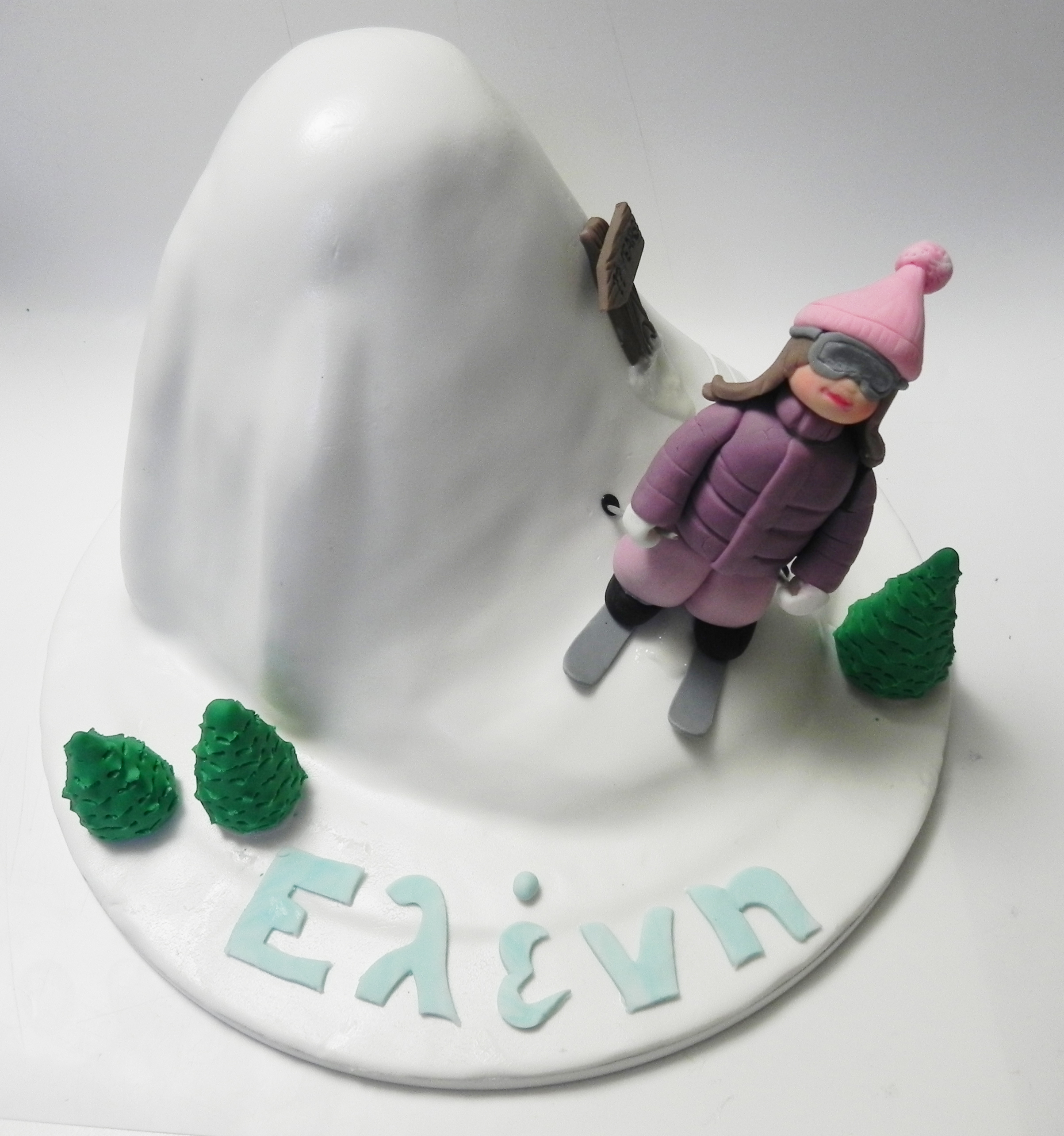Κορίτσι που κάνει σκί στο βουνό.  Η τούρτα είναι το βουνό αλλά και η φιγούρα τρώγεται.  Μπορεί να γίνει και για αγόρι σε άλλα χρώματα.