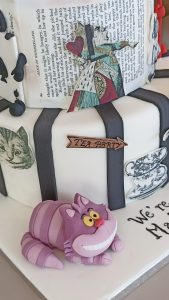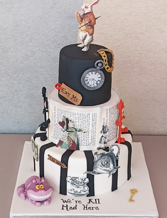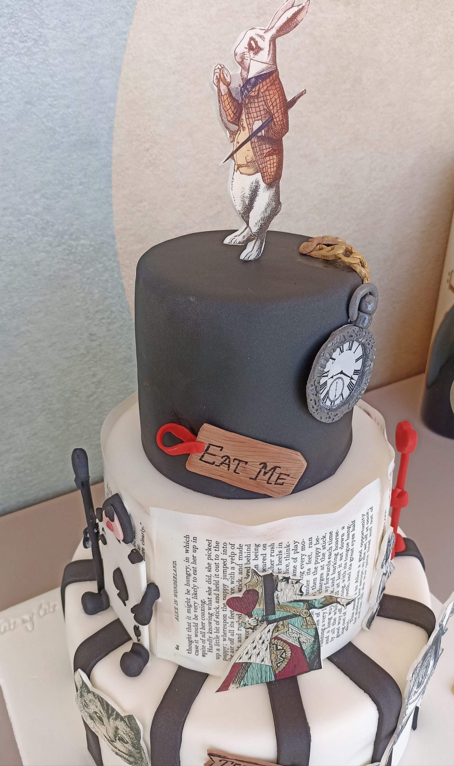 Τούρτα με θέμα  “Αλίκη στην χώρα των θαυμάτων”  με 3d διακόσμηση και βρώσιμες εκτυπώσεις απο κείμενα και εικόνες του βιβλίου .