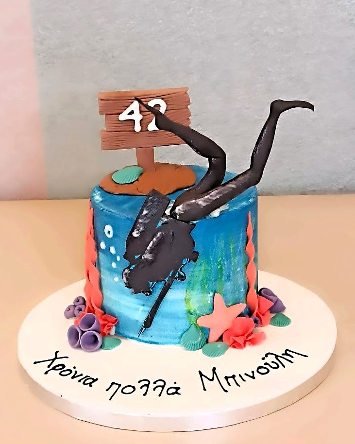 Ο δύτης σε μια κατάδυση στην θάλασσα με το ψαροντούφεκο του για το αγαπημένο του υποβρύχιο ψάρεμα ! Τούρτα με κάλυψη βουτυρόκρεμας και διακόσμηση με συνδυασμό ζαχαρόπαστας και βρώσιμης εκτύπωσης .
