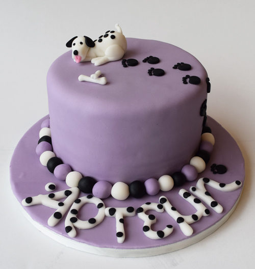 3d σκυλάκι Δαλματίας πάνω σε μωβ τούρτα .