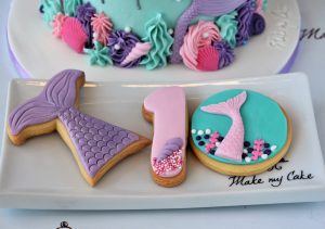Η μικρές γοργόνες βουτάνε στο νερό και οι γοργονοουρές πλατσουρίζουν στο νερό . Η τούρτα είναι naked και μπορεί να γίνει σε οποιαδήποτε επιλογή χρώματος. Συνοδευτικά μπισκότα ουρά γοργόνας και ηλικία διακοσμημένη με κοχύλια .