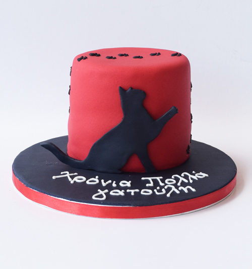 Κόκκινη τούρτα με γάτα απλικέ μαύρη, και πατουσάκια