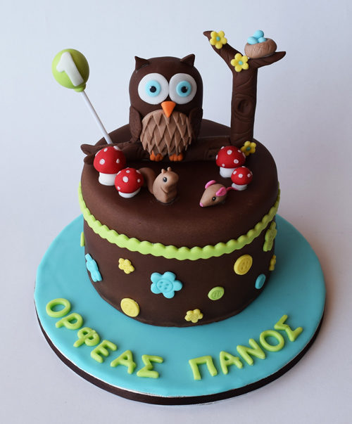 Τούρτα κουκουβάγια στο κλαδί με σκίουρο και ποντικάκι