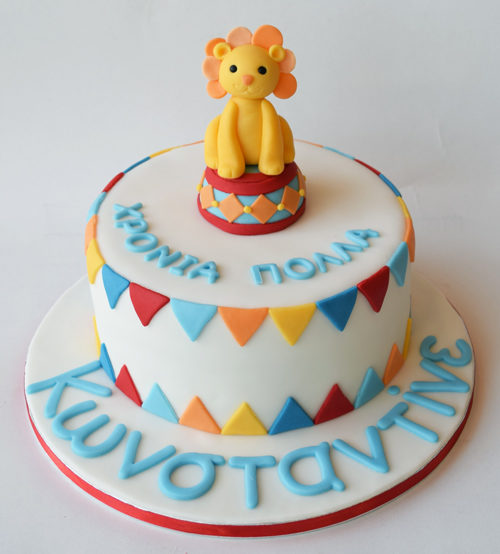 Τούρτα με λιοντάρι από ζαχαρόπαστα και σημαιάκια στην τούρτα
