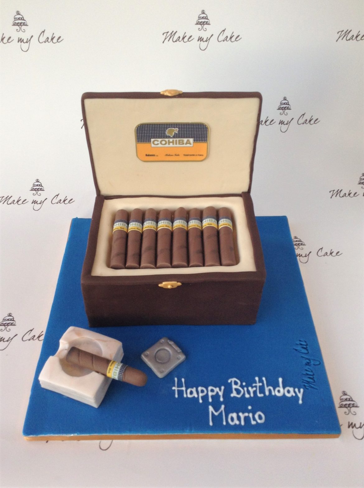 Τούρτα σε σχήμα κασετίνας Cohiba με πούρα απο ζαχαρόπαστα . Aπαραίτητα