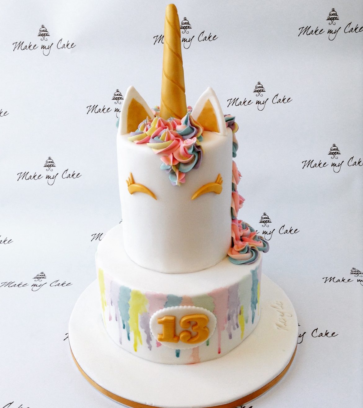 2όροφη τούρτα με κεφάλι μονόκερου και πολυχρωμο κάτω όροφο .