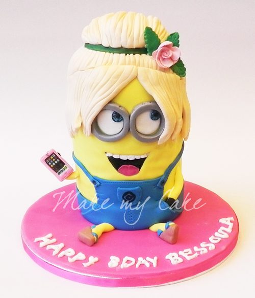 Μίνιον κορίτσι τούρτα, σε δύο ορόφους. Με λουλούδια στα μαλλιά και iph